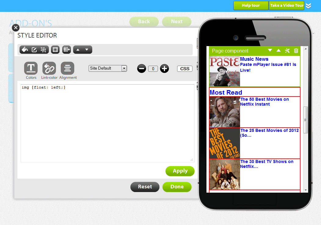 התהליך היה פשוט. הכנסתי את הURL שלי בדף הבית של האתר, לחצתי על איזה כפתור, ווואלה, אחרי דקה כבר היה לי גירסה מובייל-פרנדלי של האתר. מאחר שמדובר באיזשהו תהליך אוטומטי ממוחשב, נזקקתי אחרי כן להגדיר כמה דברים באופן ידני דרך העורכים הויזואלים שמספק השירות. לדוגמה, בחרתי רק אלמנטים אחדים מתוך כלל האלמנטים שנמצאים באתר לשם הצגתם באתר המובייל.