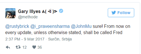 אז נלך על השם פרד, על סמך הבקשה של גארי – ונקרא לזה: עדכון פרד. אפילו השתמשתי בתמונה שלו בנוגע לפרד – דג. אז גארי מקבל קרדיט על התמונה כאן, אבל, מכיוון שהיה בחופשה במשך השבועות האחרונים, אני לא חושב שאנחנו יכולים "להאשים" אות בעדכון האלגוריתם הזה.